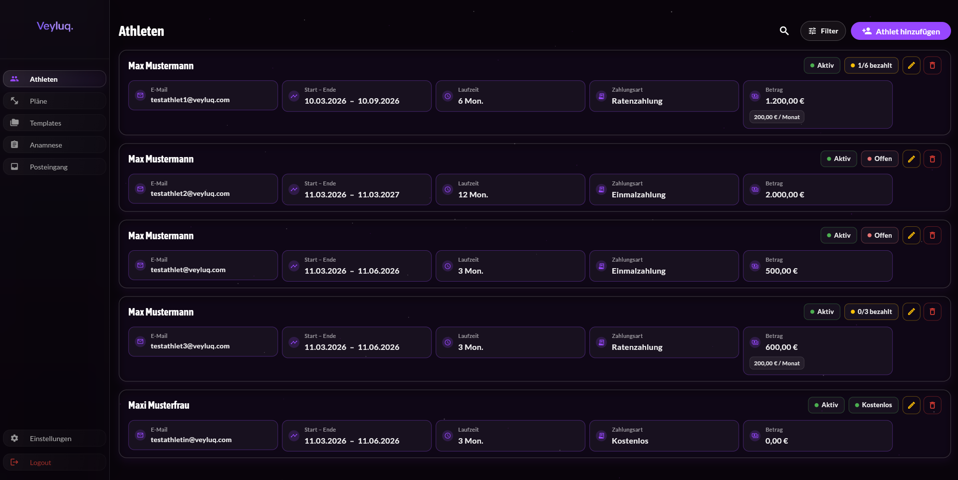 Alle Athleten, deren Status und Fortschritt auf einen Blick. Du siehst sofort, wer Aufmerksamkeit braucht.